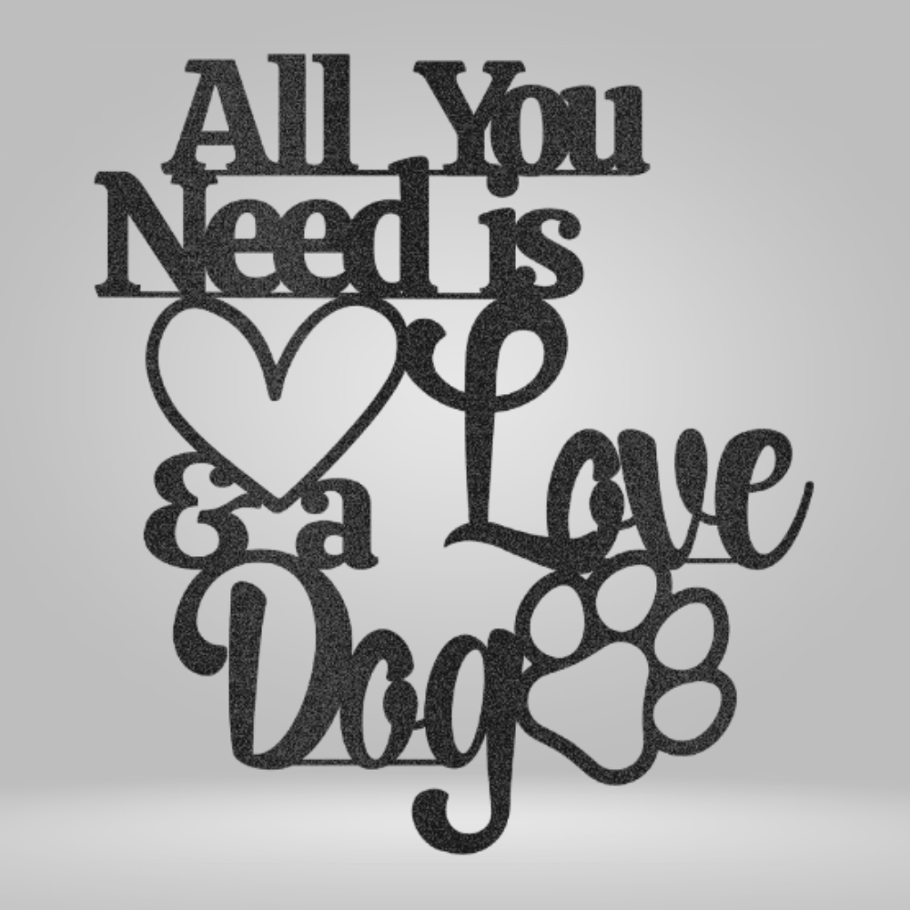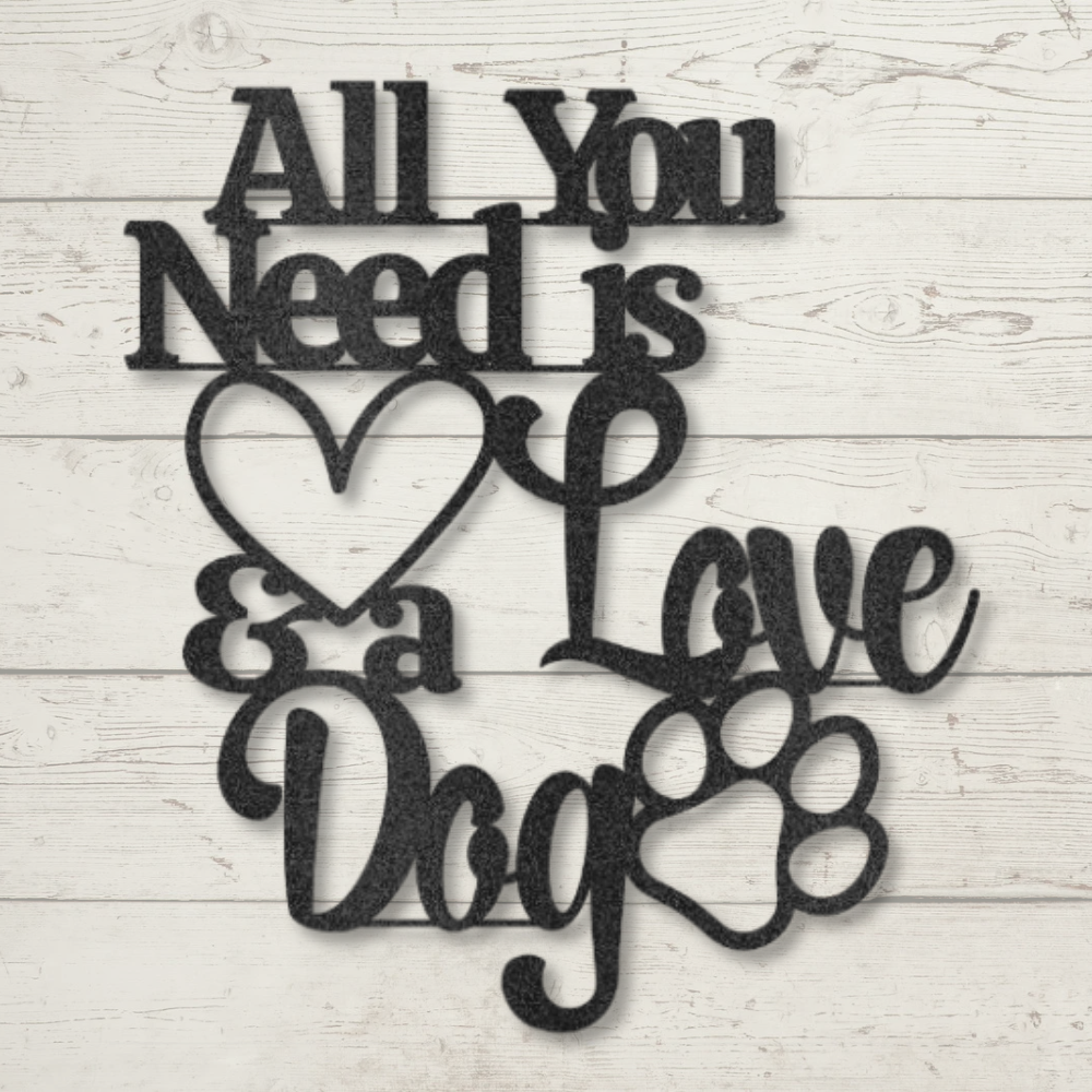 Celebrate your love for dogs with this charming “All You Need is Love and a Dog” metal wall art.