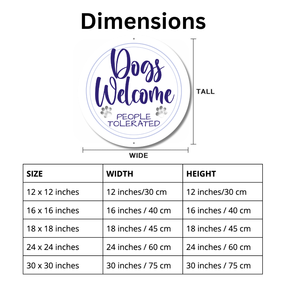 Celebrate your love for dogs with this vibrant, color-printed metal sign that reads, "Dogs Welcome, People Tolerated." Perfect for any dog lover's home, garden, or patio, this durable sign adds a fun, quirky touch to your decor while showcasing your true priorities. Weather-resistant and built to last, it’s a playful statement piece that’s sure to get a laugh!